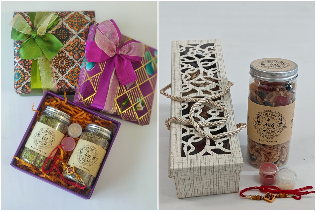 Artisanally curated, Aarti’s Kitchen hampers feature their signature savouries, sweets, and festive delicacies, beautifully packed in vibrant Gota Patti potlis, colourful jute bags, or elegant wicker baskets. Each hamper includes a handcrafted Rakhi, a custom tag, and a personalised card to make every gesture feel heartfelt. Behind every delicacy is a story of resilience — each hamper supports and empowers a community of remarkable women who bring these flavours to life.