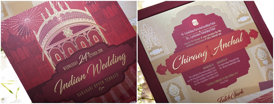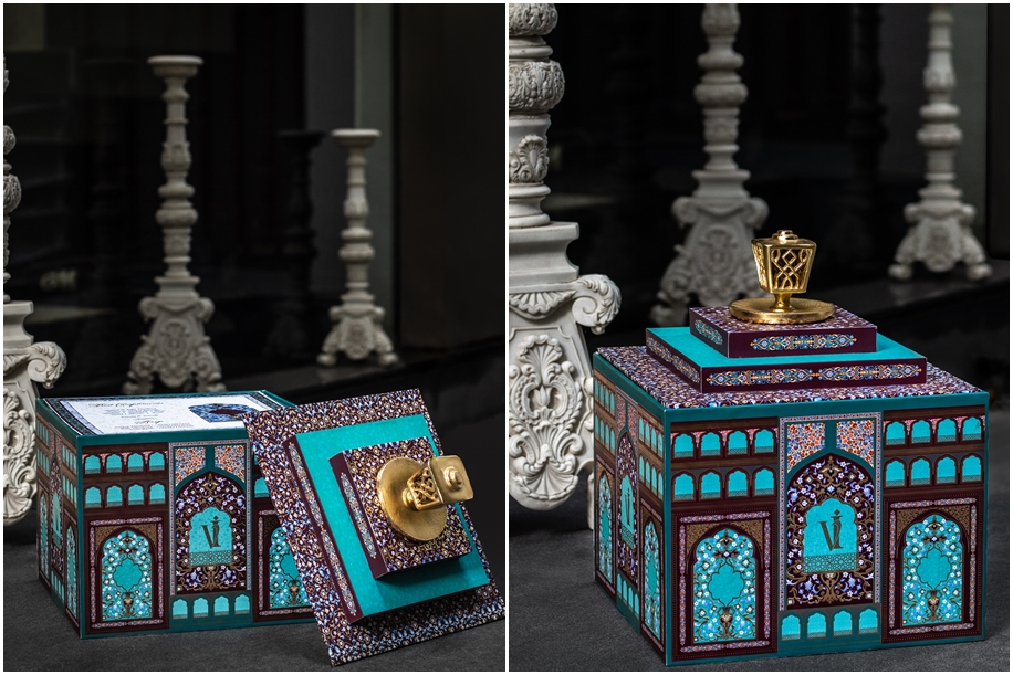 An invitation inspired by the scenes and sets of Bollywood, this creation by Izhaar spells magnificence and wonder. Ruchita Bansal shares how this luxe invitation took form. “Vaibhav and Ishita approached us just in time when the excitement surrounding the blockbuster hit ‘Padmaavat’ was fresh in the air, and most of us wanted to experience director Sanjay Leela Bhansali’s grandeur all over again. The couple’s idea was to have a lavish and elaborate wedding that would be remembered for days. Taking a cue from the royal and majestic appeal of this movie, the team spent days brainstorming ideas before producing this luxury wedding invite.”