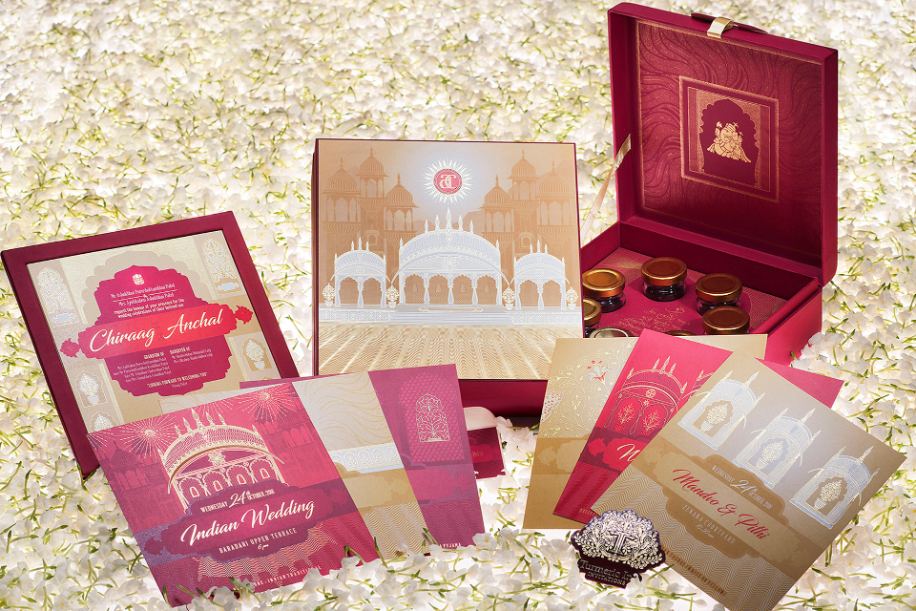 Regal and quirky may seem like an unlikely combination but Pink Whistle Man manages to ace this pairing with their Jodhpur-inspired invitation card. They present local handicraft curios alongside leaflets that feature jharoka outlines and motifs that are evocative of the time of the kings. “Through this card, we have tried to bring out the feel of Jodhpur by using the hue that the city is synonymous with at the same time adding unconventional pops of color,” explains Ranjani Iyengar.