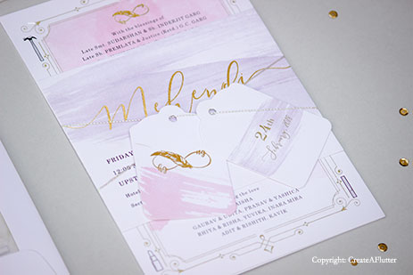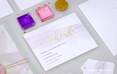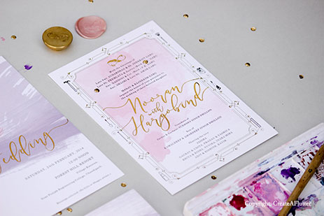 What would the invitation to a wedding between a makeup artist and a woodwork designer look like? We present this creation with artistic brushstrokes, gold calligraphy and an intuitive design that gives an elegant, rich aesthetic. Team CreateAFlutter worked a faceted brief – subtle, minimal, unusual, fun, sophisticated – and came up with this. They say, “We feel the Brush Stroke Suite invitation is one of our many uncommon invitations and it explains the marriage of these two artistic individuals beautifully.”
