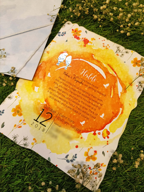 This wedding invitation card designed by Kankotri reflects the sheer elegance of the wedding to come. The team decodes the design for us, “The inspiration behind the design was a Love Bird theme. We used watercolor washes and a splash of florals and every insert was designed with absolute attention to detail; vibrant colors for each function, different birds and a very cute, innovative script provided by the bride herself.”