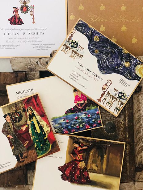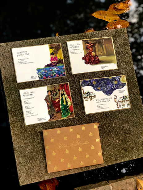The sky’s the limit when it comes to inspirations for a wedding invitation. The world of art itself is an endless palette of color, concept and cues. Pink Whistle Man managed to pull off an art-history themed wedding invite that is a curated look at some of the world’s favorite paintings. Ranjani of Pink Whistle Man tells us about it, “Anshita and Chetan studied art history together and I was really very keen on using that as the core element in the card. Together we explored different themes and picked Impressionism as the binding element and then matched famous Impressionist paintings to details of each function. For example, the welcome dinner, to be held outdoors was announced by Van Gogh’s Starry Night. The mehndi was by a pond so of course, we used Monet’s Water Lilies!”