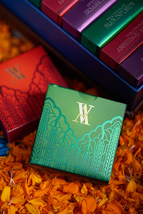 The couple provided the creative folks at Turmeric Ink with inspiration for this very personal invitation. They say, “Arvind is an architect and Vrinda is an art historian, both based in London. They share a love for Art Deco and Mumbai (one of the world’s Art Deco capitals) is where they’re both from. That was where we found the seeds of inspiration for their wedding suite. We used a unique printing technique evolved exclusively by us, and included a bag; two slim boxes of custom packaged chocolates and personalized wax seals.”