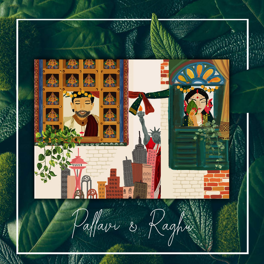 This cleverly designed invite by Pink Whistle Man honored the bride and groom’s heritages, personas and of course, their love story. The Telugu groom was portrayed with traditional splendor against the architecture of the iconic Vaikuntha Dwaram of the Tirumala Temple, as well as the Seattle skyline, where he works. The bride, who hails from New York, is re-imagined as a traditional Bengali bride against a quintessential Kolkata street window and the Manhattan skyline.