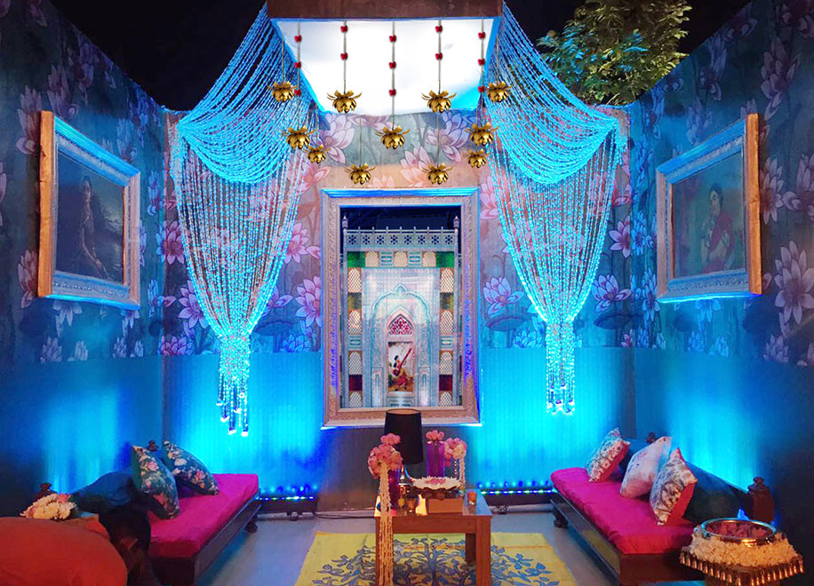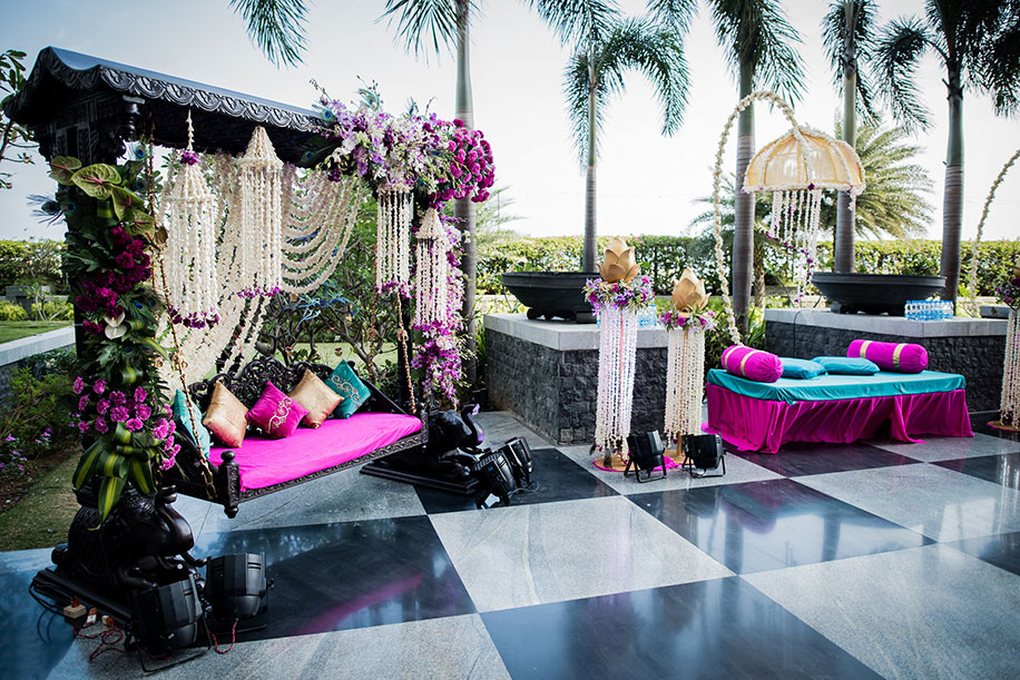 “Art, enhanced by fresh flowers is a trend that is gaining popularity as wedding décor. For one sangeet night, we incorporated Raja Ravi Varma’s beautiful paintings, added ranjnigandhas and lotuses and voila, an incomparable exotic, ethnic vibe. Add props like cushions, bling, glitter and throws and you’ll have amplified a wonderful ambience.”