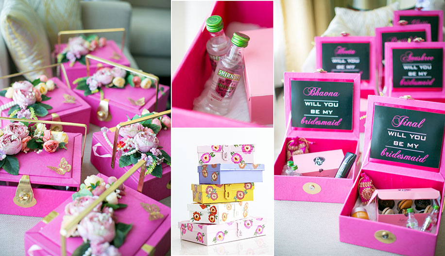 Surprise your squad with personalized goodie boxes from Wedding Lounge. Kickstart the celebrations by stuffing these pretty boxes with miniature Smirnoff vodka or Johnnie Walker whiskey bottles. Add in some sweet treats like brownies and cupcakes to make it a complete treat.