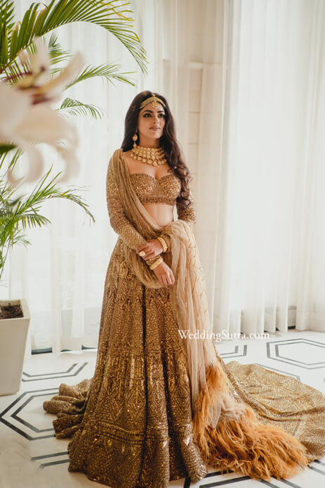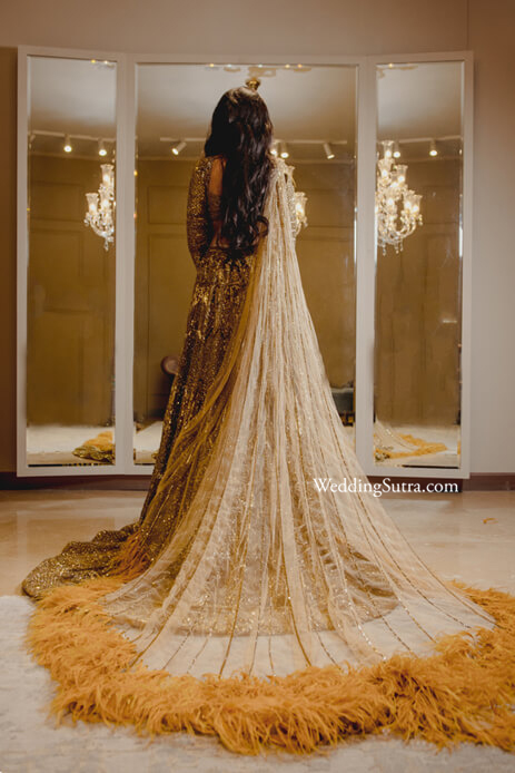 “The bride and groom will have all eyes on them, and for the main day, I suggest the couple opt for shimmery wedding outfits. A bride could wear an ensemble like a long trailing lehenga accentuated with feathers, capes, floral wreaths and dramatic jewellery. The idea is to create something pretty and stylish, with a remarkable difference.”