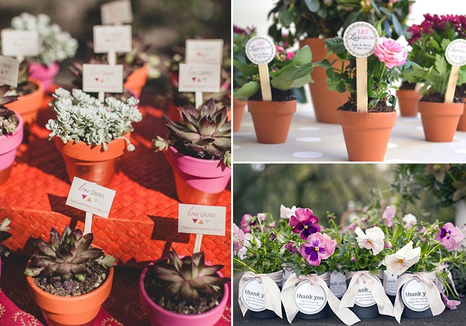 Give your wedding guests a wonderful surprise with these tiny potted blooms or succulents.