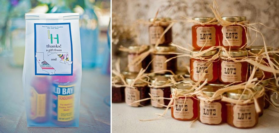 Treat your guests to tiny bottles of marmalades, chutneys, jams, barbecue sauce, salsa, maple syrup and honey, packed in a gift basket. Add a lasting memory with customized tags with your wedding monogram.