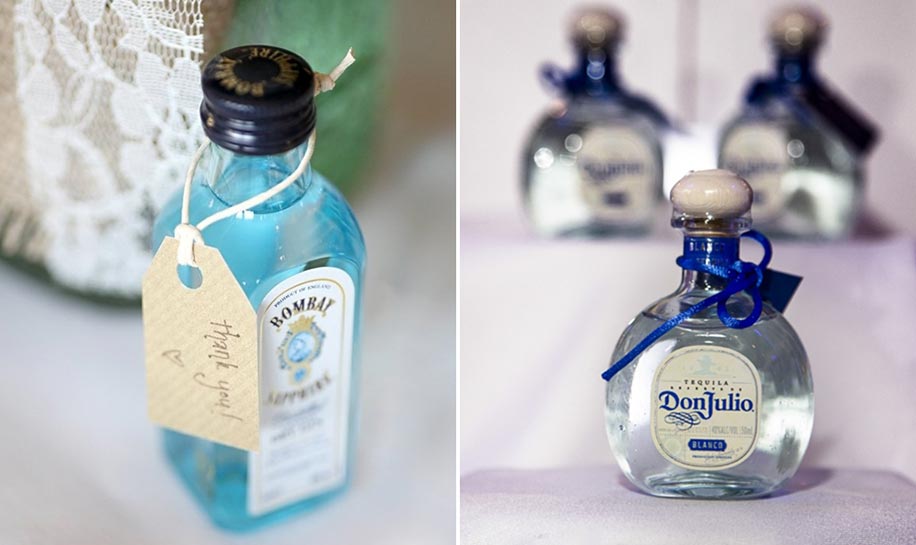 Customize miniature Johnnie Walker or Ciroc and Smirnoff miniature bottles with custom-printed labels by Hops Cork for your wedding to be given away as favors and stay high spirited.