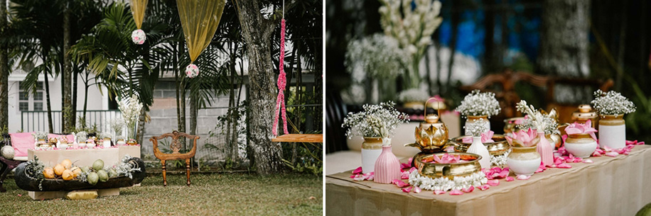“This ceremony took place at Lakesong Resort, Kumarakom. It was a typical Nair wedding; elegant and brief, unlike elaborate Punjabi weddings. There were very few rituals and fewer religious compulsions, which was quite new for me since I am North Indian, but I absolutely loved the simplicity of it all. Pink, white and green with a touch of gold made for an enchanting colour scheme for this beautiful ceremony. A mandap decorated with white drapes and pink and white florals looked elegant against the picturesque background. We had a beautiful ceremony witnessed by our nearest and dearest. It was magical. The ceremony was breathtaking and I felt like I was in a fairytale. We wore traditional outfits that were simple yet elegant.”