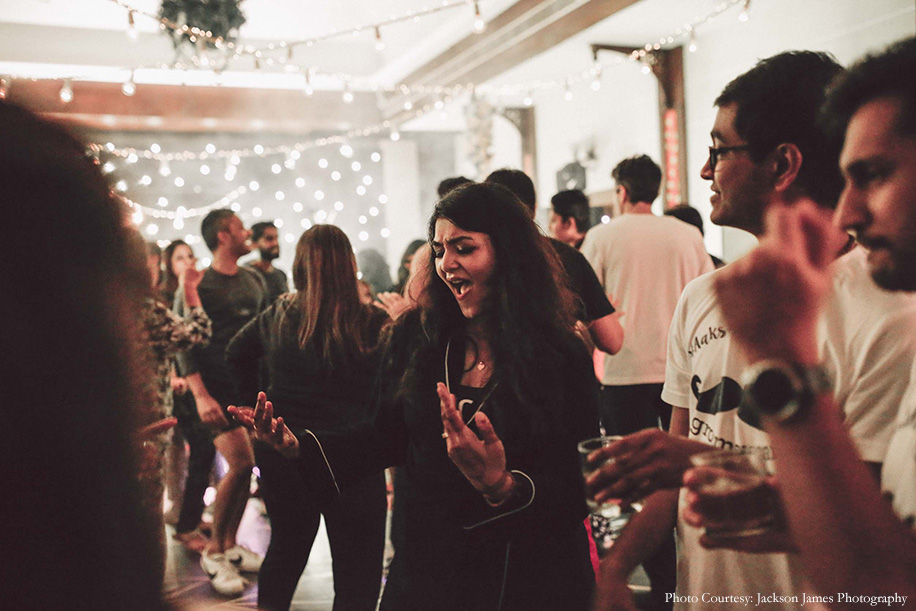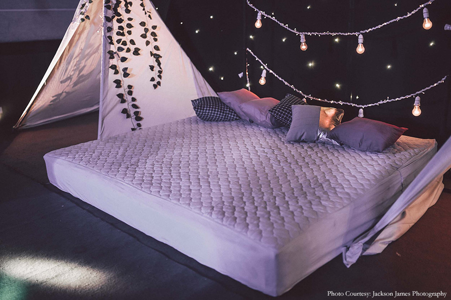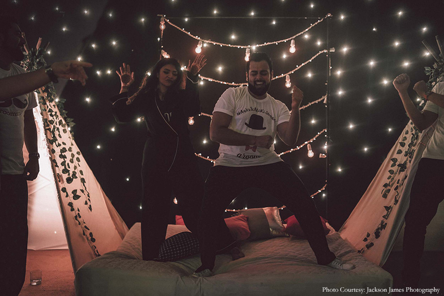 “Once we were done with the traditional wedding ceremonies, we really just wanted to let our hair down and do what we do best, have fun! So, Aditya and I decided to have a Pyjama Party where guests could simply be comfortable and make the most of the last party to conclude the wedding festivities. Our friends and families dressed up in matching pyjama-t-shirts from Aditya’s side and pyjama sets from my side. There were even some who came in their bathrobes. We danced all night and made great use of the mattress (part of the Pyjama Party decor) as a bouncy castle, celebrated till the wee hours of the morning. The décor included some fun elements, such as tents, flags, throw pillows along with the spring mattress that matched the theme of the party.”