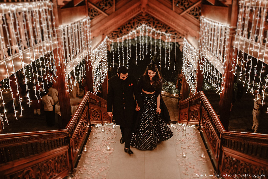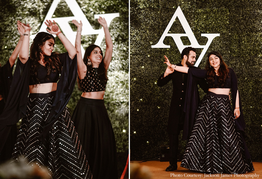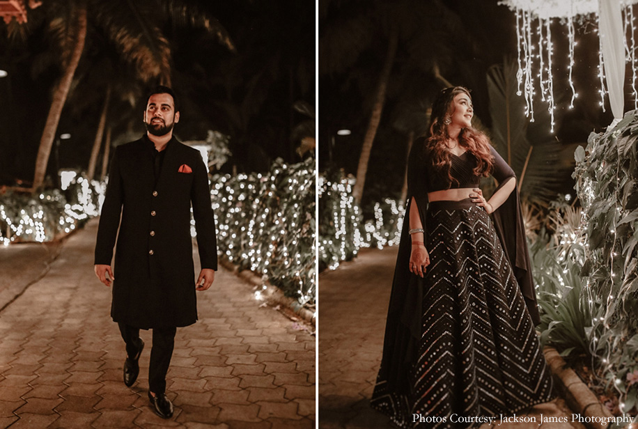 “After the Mehndi, we had the sangeet later that night at Lakesong Resort, Kumarakom. The resort was exceptionally good with their hospitality and we loved how they went above and beyond to make this celebration a memorable one for us. We kept suspended yellow lights and leaves as our décor highlights, keeping greenery as the main aesthetic. Aditya and I wore dark colors to go with the glamor of the night. The evening comprised of heartwarming performances & speeches by our nearest & dearest and everyone had a great time dancing to Bollywood tunes.”