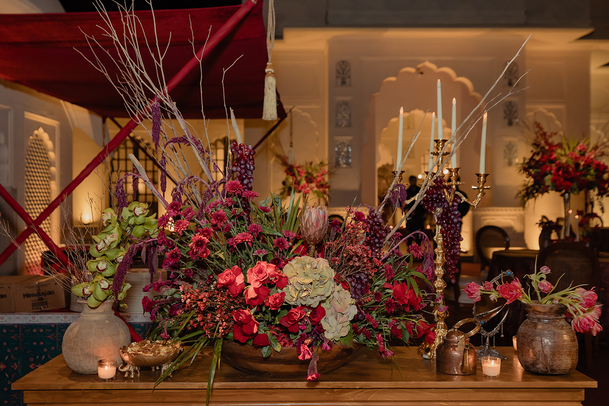The festivities began with Jalsa, a vibrant celebration designed to immerse South Indian guests in the high-energy spirit of Punjabi revelry. Set against a backdrop of hand-painted vases, traditional textiles, and shola flower arrangements, the morning commenced with Aashna’s intimate chooda ceremony. As guests poured in, the mood escalated—kaleeras danced in the air, and DJ Sukhbir turned up the tempo as the bride led a joyous dancefloor frenzy.