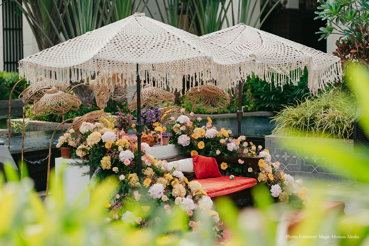 The haldi was a mix of boho elements and whimsical floral decor that looked stunning under the sunlit sky. Macrame parasols, larger-than-life blooms crafted of cane and lush foliage, completed the decor.