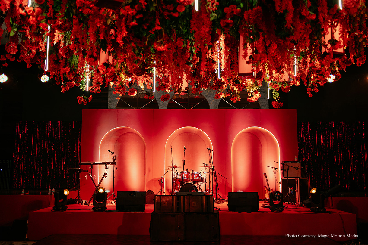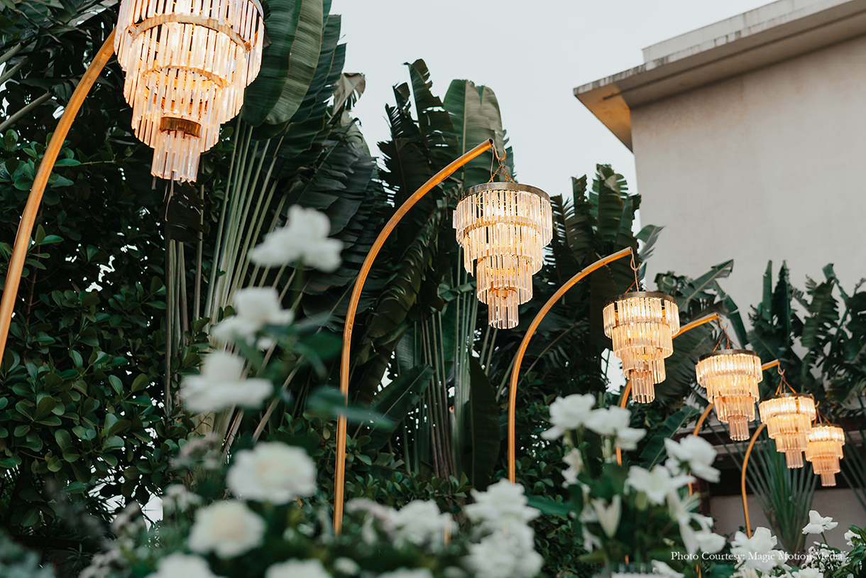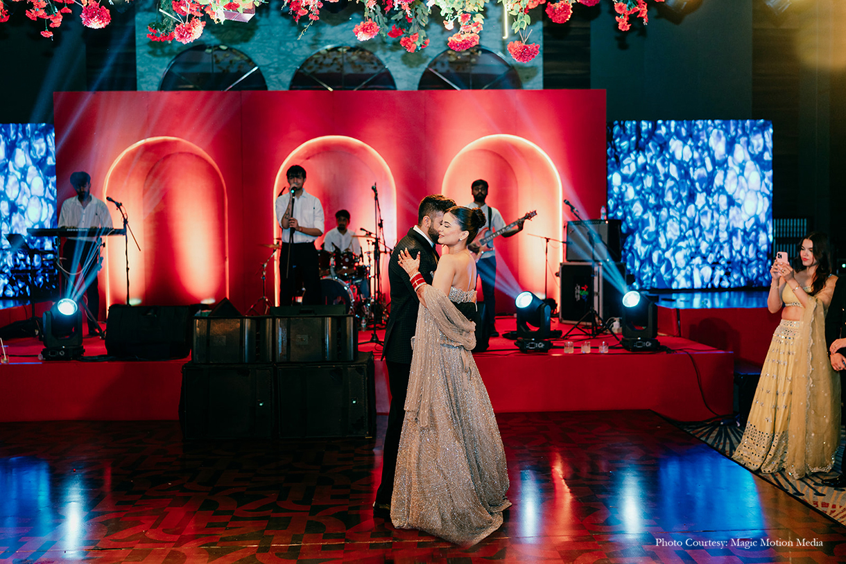 Nazara was at its creative best on the design front, coming up with detailed setups that conveyed the couple’s journey. The reception event design was especially heartfelt, giving the guests a peek into the couple’s journey. Kriti from Nazara shares, “Set against the breezy charm of The Westin Goa, this wedding unfolded over five thoughtfully curated events, each reflecting the couple’s unique vision. From a warm welcome dinner to a showstopping reception, every detail was crafted with intention—from Tulum-inspired hues for the haldi to a jungle-themed sangeet turned speakeasy, and a contemporary mandap free of traditional trussing. At its core, the celebration was a soulful blend of style and storytelling—most memorably captured in the photo-gallery tunnel that left guests both awed and deeply moved.” Magic Motion Media photographed the couple’s candid moments as they celebrated their union surrounded by their loved ones.