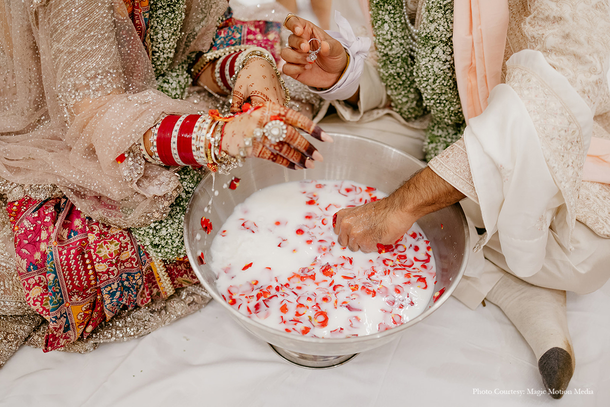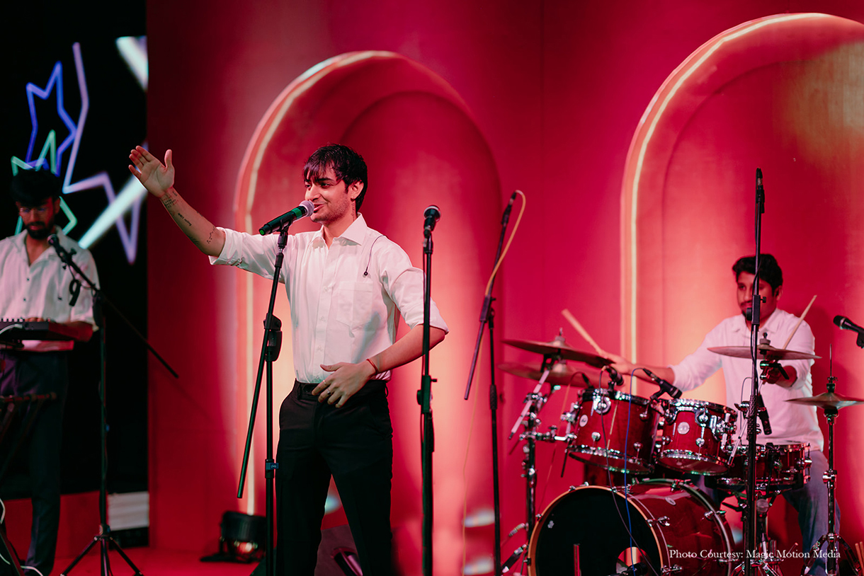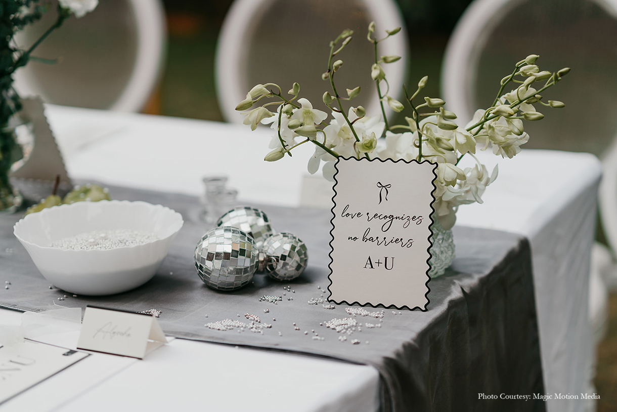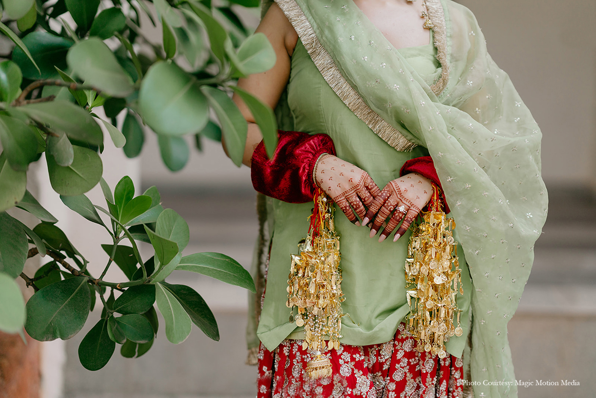 Nazara was at its creative best on the design front, coming up with detailed setups that conveyed the couple’s journey. The reception event design was especially heartfelt, giving the guests a peek into the couple’s journey. Kriti from Nazara shares, “Set against the breezy charm of The Westin Goa, this wedding unfolded over five thoughtfully curated events, each reflecting the couple’s unique vision. From a warm welcome dinner to a showstopping reception, every detail was crafted with intention—from Tulum-inspired hues for the haldi to a jungle-themed sangeet turned speakeasy, and a contemporary mandap free of traditional trussing. At its core, the celebration was a soulful blend of style and storytelling—most memorably captured in the photo-gallery tunnel that left guests both awed and deeply moved.” Magic Motion Media photographed the couple’s candid moments as they celebrated their union surrounded by their loved ones.