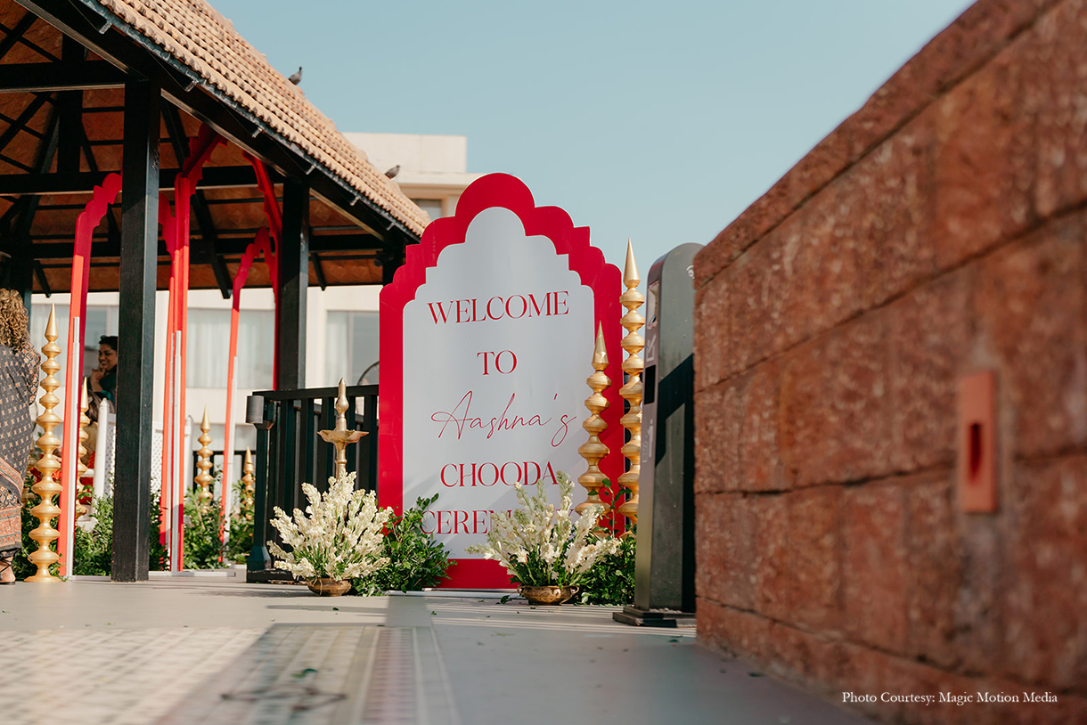 Aashna’s chooda ceremony radiated traditional charm with its brass urlis, diya stands and fragrant tuberoses. Accentuating the earthy architecture of the venue were hues of red that looked striking against the lush green foliage.