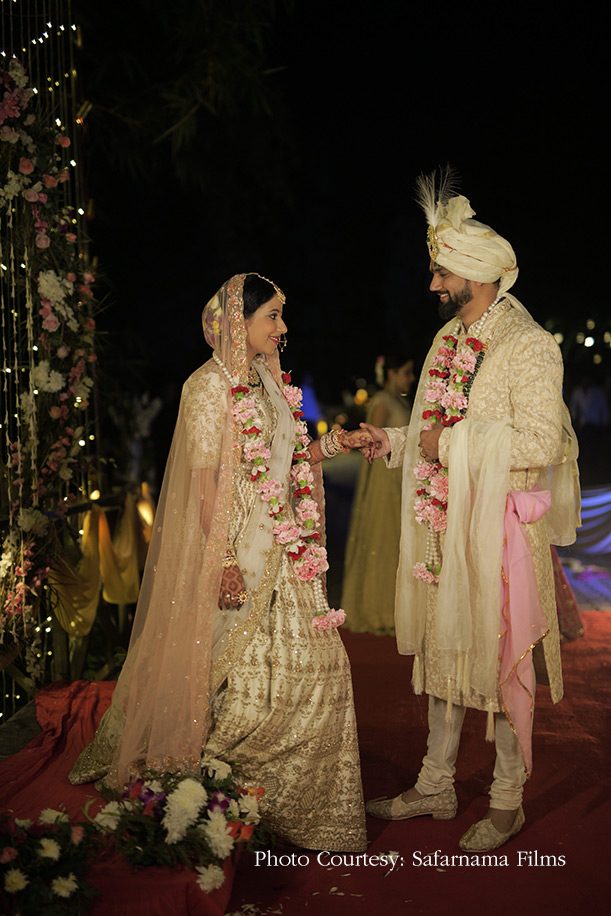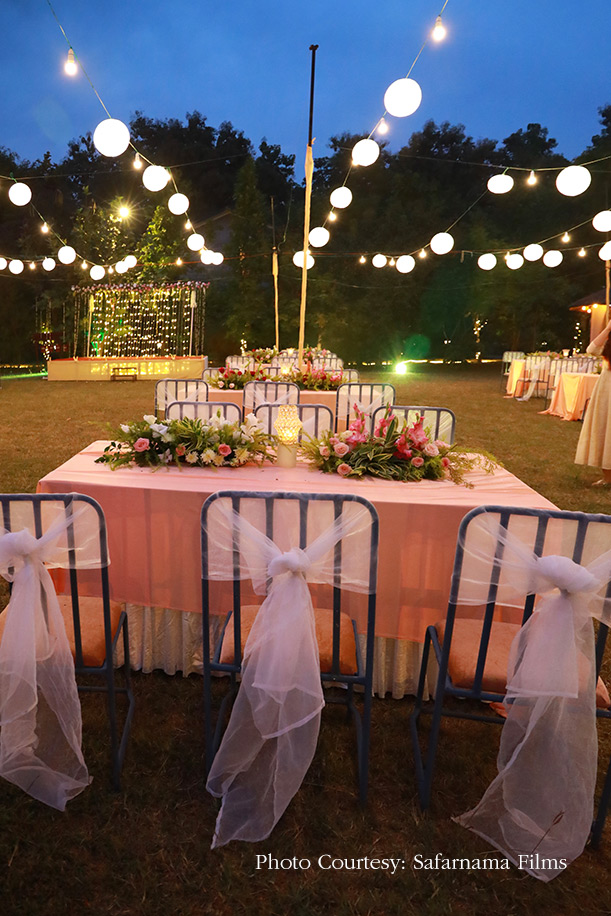 The outdoor wedding function was a dreamy starlit affair. Minimalistic lighting with lanterns and pastel flowers were used to enhance the beauty of the lush surroundings. The bride and groom looked ethereal in matching ensembles with an ivory, gold and blush palette, which were embellished with intricate embroidery.