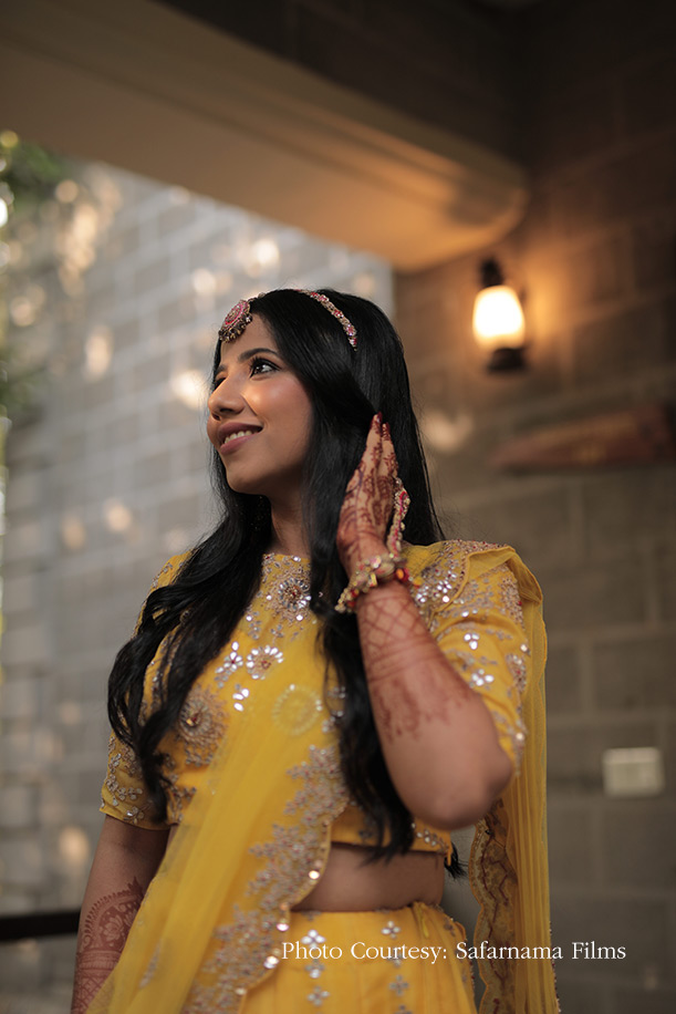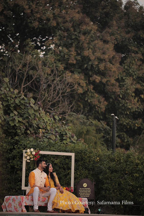 The mehndi ceremony was a vibrant and musical event with colorful yet minimal decor comprising props, flowers, drapes and seating arrangements adding to the beauty of the forest backdrop. The couple along with their wedding party entered the function dancing to lively music. The bride looked radiant in a yellow lehenga which the groom complemented in his mustard silk kurta pyjama and bandi jacket.