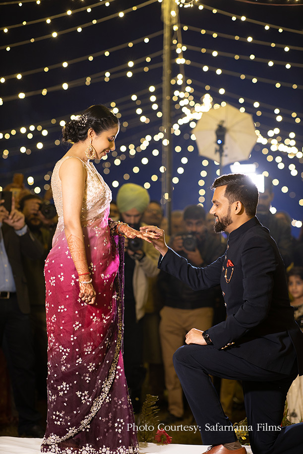 The festivities commenced with an evening engagement function. The bride and groom to be, dressed in a shimmering ombre pink saree and a suave bandhgala suit respectively, entered to the glitter and drama of a spectacular cold pyro display before exchanging rings. The decor of lights and candles lent an air of magic to the evening.