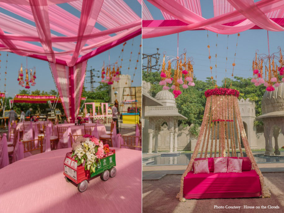 “The theme of the mehndi was a pink ‘mela’ (fair). Pink, because we were in the Pink City of Jaipur, and ‘mela’ because we wanted an authentic Rajasthani vibe for this event. We had folk dancers, carnival games, and traditional Rajasthani dance lessons for our guests.”