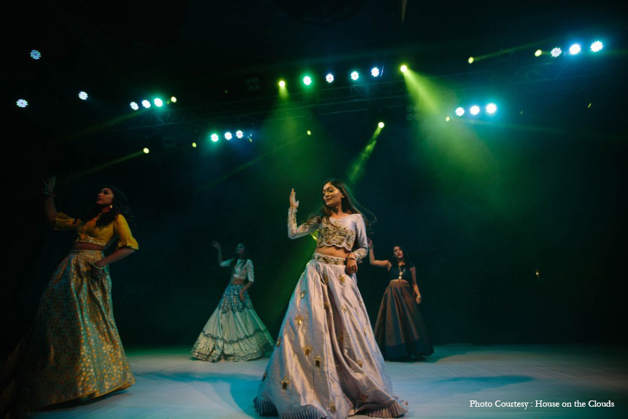 “The sangeet theme was ‘Starry Night.’ We chose white and blue as the theme colors and this night’s programme was full of dances from both sides of the family. Sagar and I decided to enter the venue with fireworks in the background. The entire stage backdrop was covered with rice lights, and we had a suspended star from the ceiling to add to the theme.”