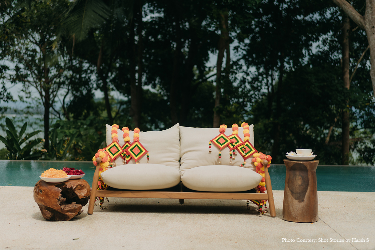 Set against a lush tropical backdrop, Aishwarya and Vishal’s haldi celebration unfolded by the pool in a riot of colour, laughter, and unfiltered joy. The décor embraced minimal elegance as a soft cream sofa adorned with bright marigold and gota accents, rustic wooden elements, and serene water reflections added to the charm. Dressed in vibrant hues, the couple made a spirited entrance, setting the tone for a celebration that was high on energy.