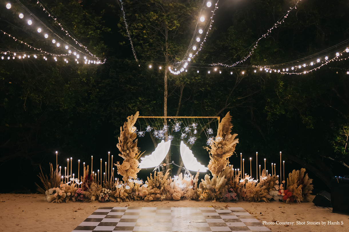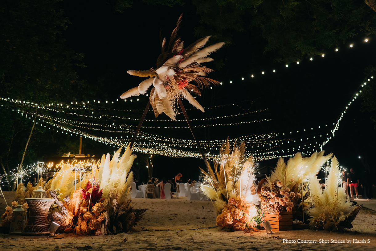 Aishwarya and Vishal’s sangeet was a magical night under the stars, where glamour met effortless charm on the golden sands of Thailand. Draped in a canopy of fairy lights and glowing bulbs, the beach was transformed into a celestial wonderland. Pampas grass, dried florals, and dramatic feathered installations framed the dance floor, while soft candlelight and whimsical details added warmth to the setting.