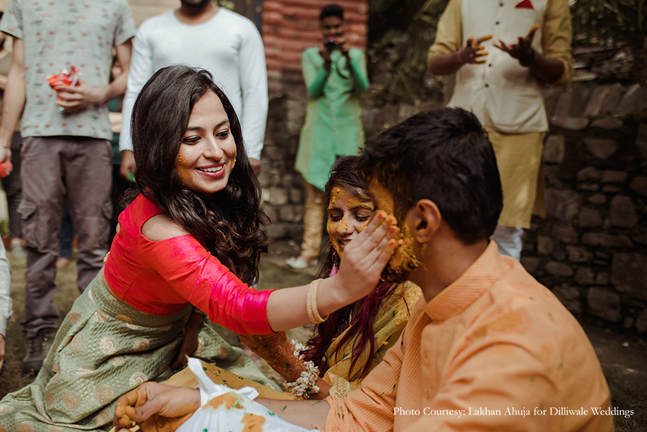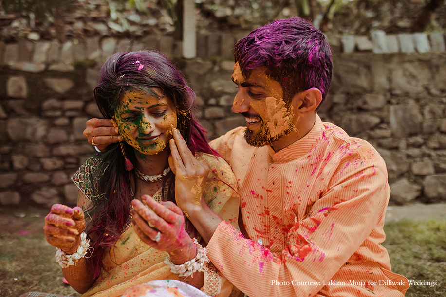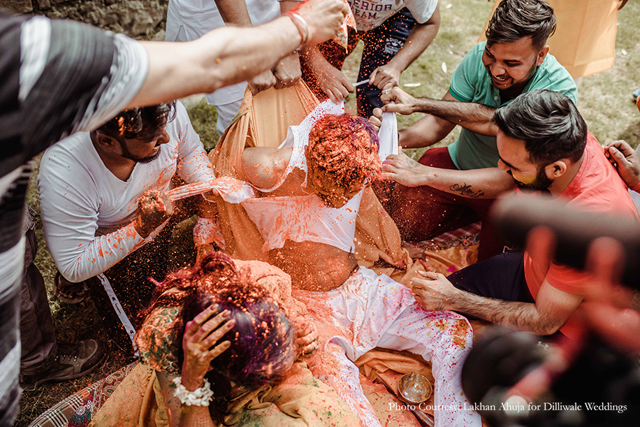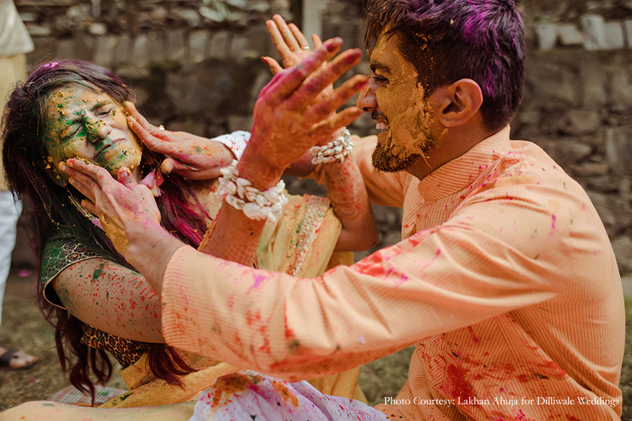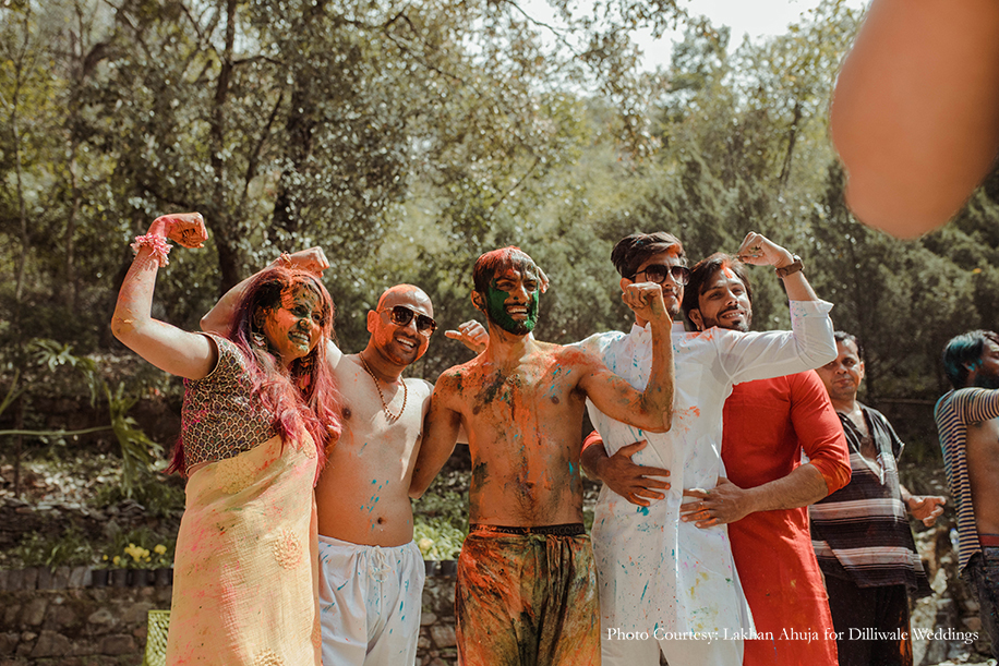 Instead of a conventional haldi ceremony, Akanksha and Vardaan were treated to a colourful Holi party by their families and friends after getting turmeric paste smeared on themselves. Vibrant and fun-filled, the ‘Holi-Haldi’ ceremony was one of the most memorable events for the couple and their loved ones.
