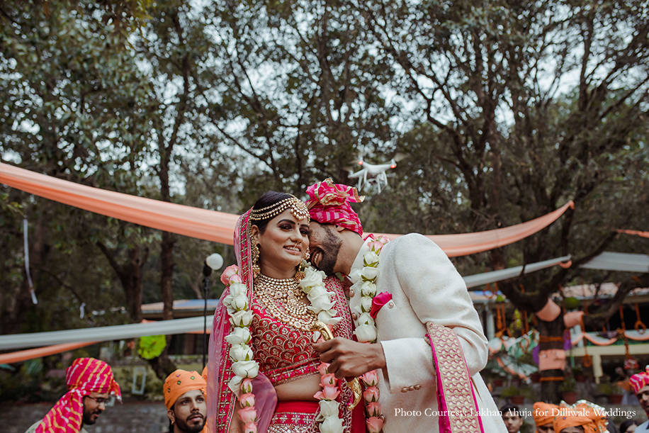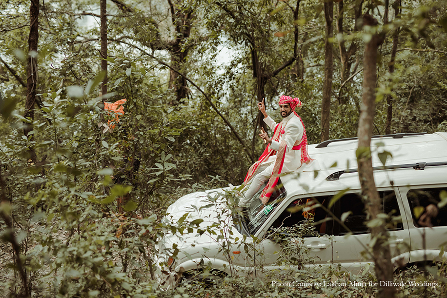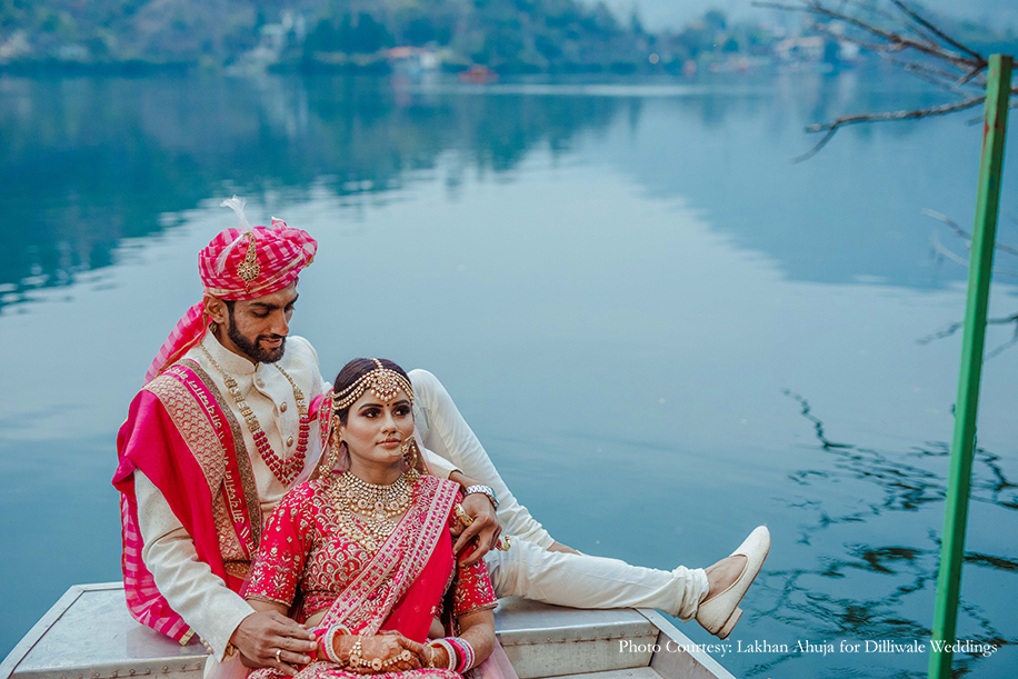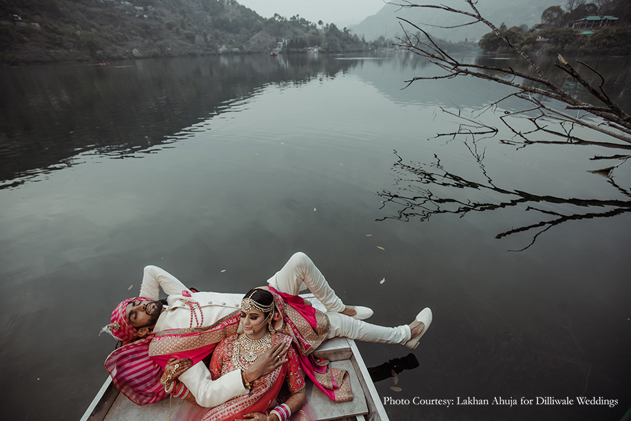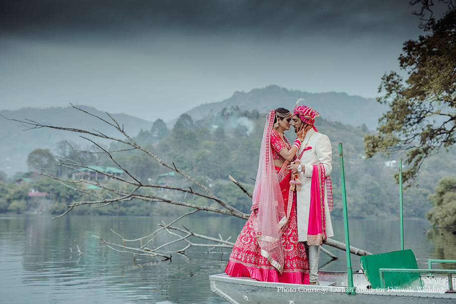 The wedding ceremony was held on the banks of the Naukuchiatal Lake. The groom and his squad made an entry via a ‘bike baraat.’ After the rituals were over, Vardaan stole Akanksha away from the guests and took her to an isolated boat on the Naukuchiatal Lake where the couple got gorgeous portraits shot by their wedding photography team.