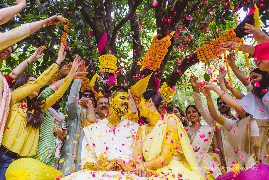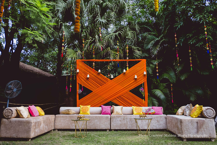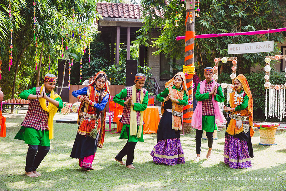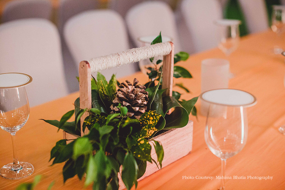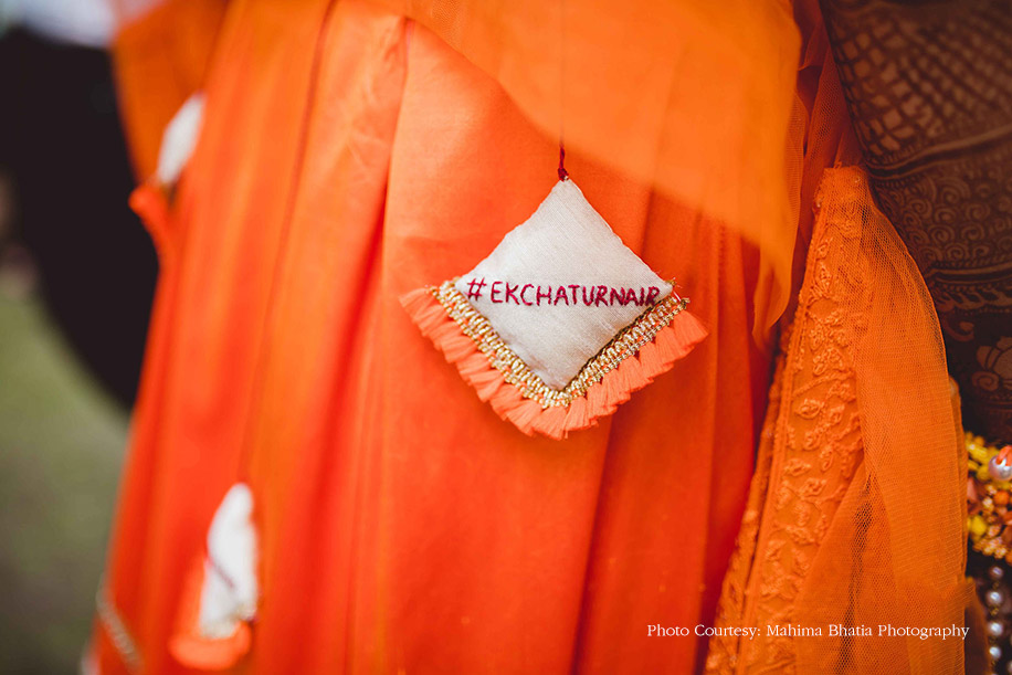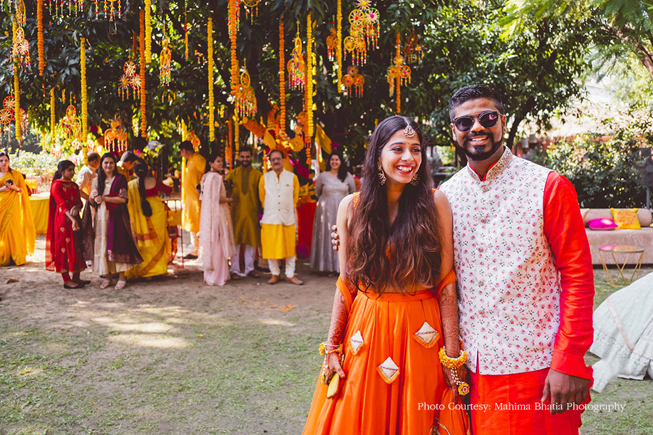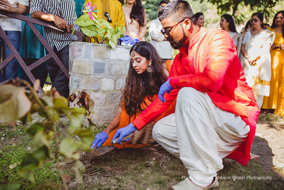 Later that evening, the couple hosted their mehndi function at the same venue where all the guests were welcomed to a traditional Kumaoni dance. The duo entered in an electric rickshaw wearing color-coordinated outfits. The groom wore a bright orange kurta, and the bride got her orange lehenga designed by the groom’s sister, Srishti Menon. The bride shares the thought process that went behind creating the lehenga, “I like to call this lehenga Aubade, a synonym for the sun. It also has a different meaning, i.e. a piece of a love song sung outdoors at the break of dawn. The lehenga featured small potlis with our hashtag embroidered on it where the guests from the wedding wrote down their special messages for us.” The to-be-weds, along with their guests later ventured out to pot plants around the property as a mark to a great beginning.