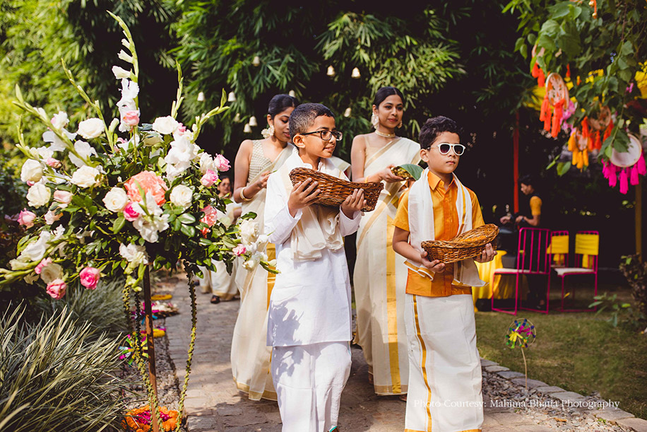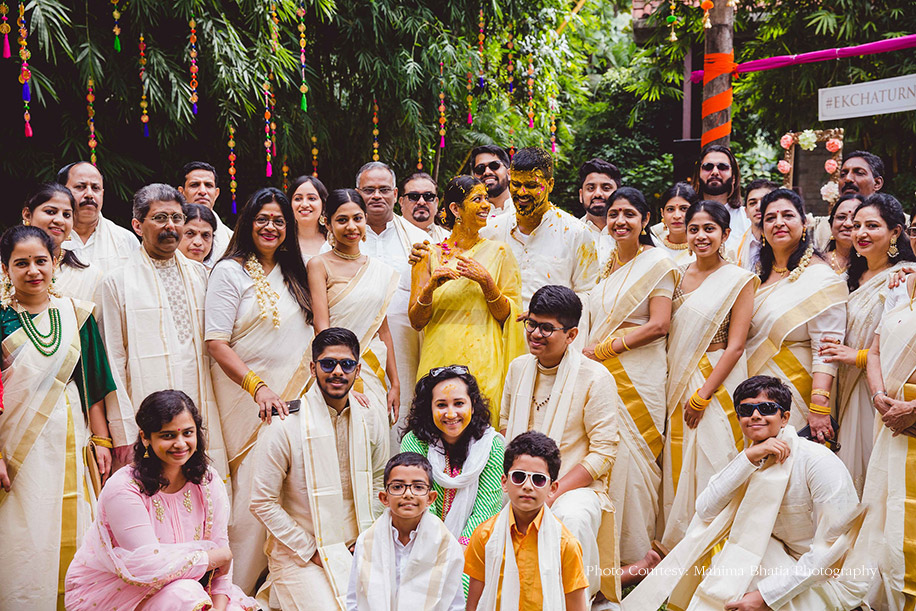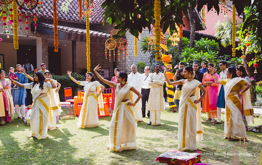 The next day was their haldi function where the couple had the venue decorated with fresh marigolds and colorful elements which were scattered throughout the venue. The bride and her family entered wearing outfits following a yellow tone while the groom’s side was dressed in traditional white and gold kasavu sarees and mundu for the women and men respectively. The ladies from the groom’s side graced the occasion by presenting a beautiful choreographed dance.