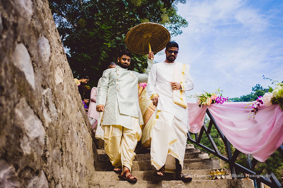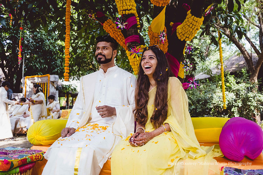 Akansha and Rishabh, with their quirky hashtag #EkChaturNair, stole our hearts with their beautiful wedding at the stunning property of Taj Corbett Resort & Spa in Uttarakhand. Surrounded by grassy mountains on all sides, offering a panoramic view of the dense forests on the Himalayan range sits thisthe Himalayan range, this lush property was perfect for celebrating their off-beat wedding.