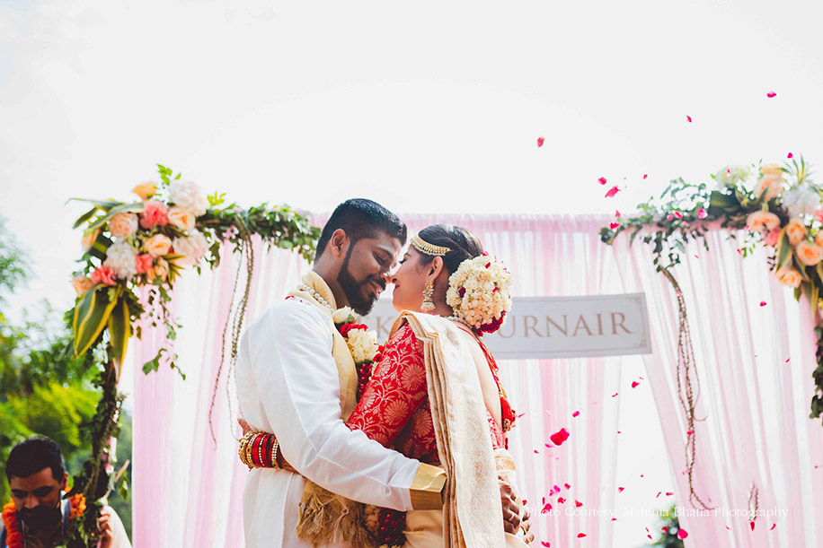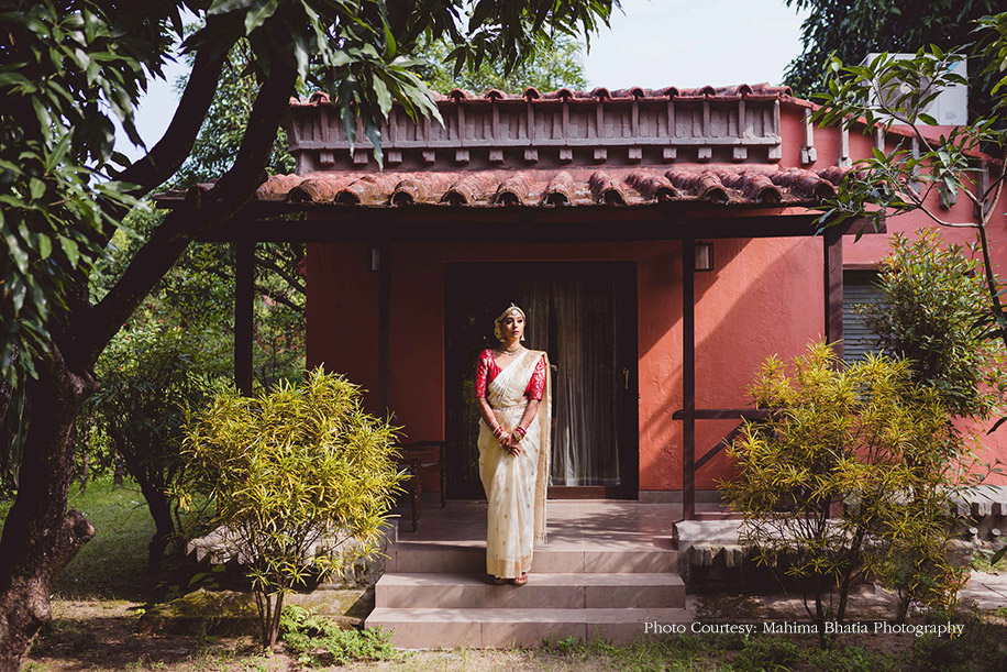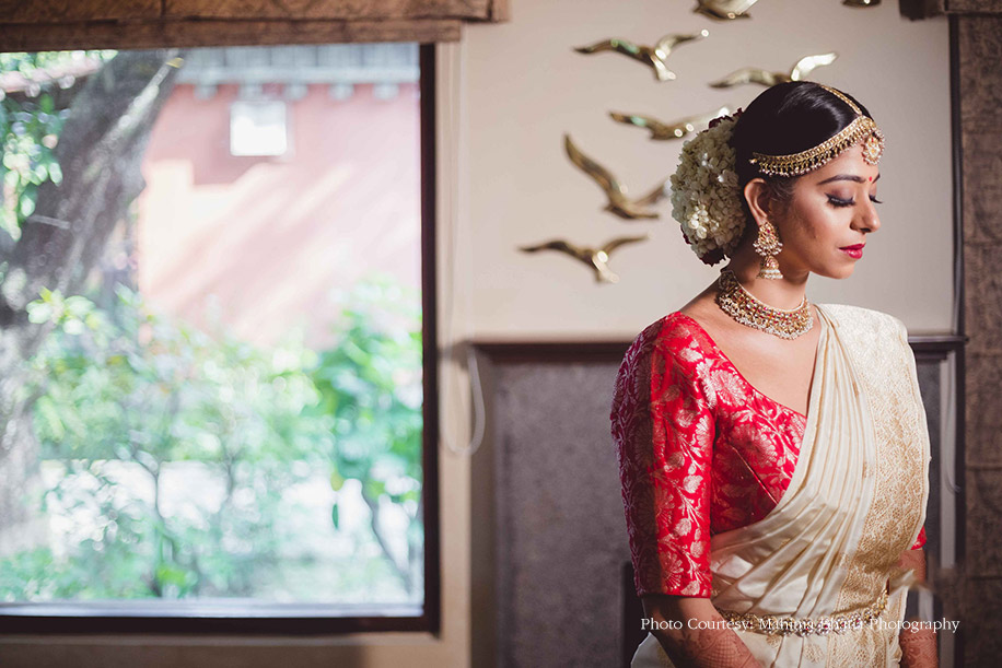For the wedding, the couple got a simple mandap set up against the beautiful backdrop of a burbling river. The groom was dressed in a traditional white kurta and a mundu by Frontier Raas and had their wedding date embroidered on it while the bride recreated her mother’s wedding look by wearing an elegant beige Banarasi saree with zari work and a red blouse by OhFab. Her outfit had a personal touch with their wedding date and both their names weaved into the piece by the talented artisans in Banaras who fought against time and floods to make sure the bride had the saree ready in time for her wedding. The glowing bride wanted to maintain a subtle look that didn’t look overly done. She also wanted her beautiful almond-shaped eyes to be enhanced for all her looks, which was done to precise perfection by the WeddingSutra Favorite – Ridhi Mahna of Get Gorgeous with Ridhi, who cast her magic on the beautiful bride’s face and hair. After the wedding ceremonies got over, the newlyweds had an intimate Bidaai ceremony.