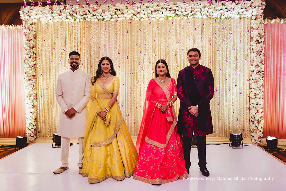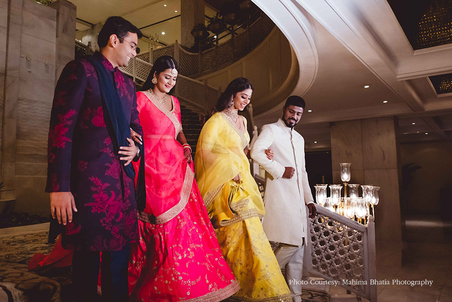 Akanksha and Rishabh, along with her sister and her husband, had a combined reception at the property. The brides were dressed in beautiful Sabyasachi Mukherjee ensembles while the grooms picked their outfits from Heritage.