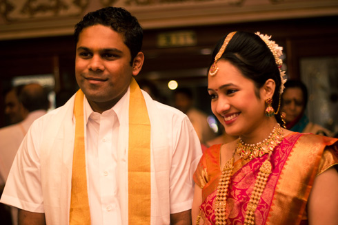 The evening wedding and reception was held at Ramoji Film City’s sprawling green lawns, the Baraat proceeded from Sitara Hotel where they were staying towards the lawns. For the first time the ever-smiling Akruthi looked a little tense as she waited for the groom to arrive; after the traditional welcome the bride and groom proceeded to the stage where hundreds of guests came to greet and congratulate them. The reception over, the bride and groom looked a little tired, but as they proceeded to the Mandap where it was time to exchange wedding vows, we noticed the tired look disappear; Akruthi glowed with joy as the Priest conducted the rituals, and Nikhil smiled as he realized he and Akruthi were now husband and wife.
