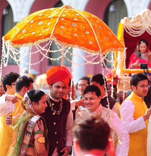 The next day was a traditional Rajasthani theme by the lawns next to Sitaara Hotel. The guests were welcomed with chilled almond milk by the bride’s uncles. The decor was colorful with Rajasthani elements and the food an amazing spread of the state’s spicy and rich delicacies by Bangalore-based Nimantran Caterers.