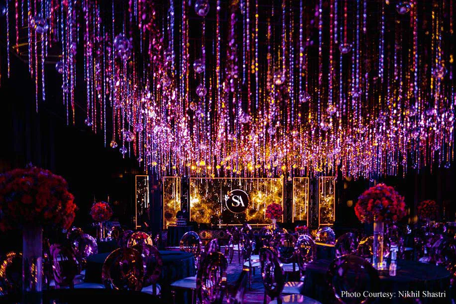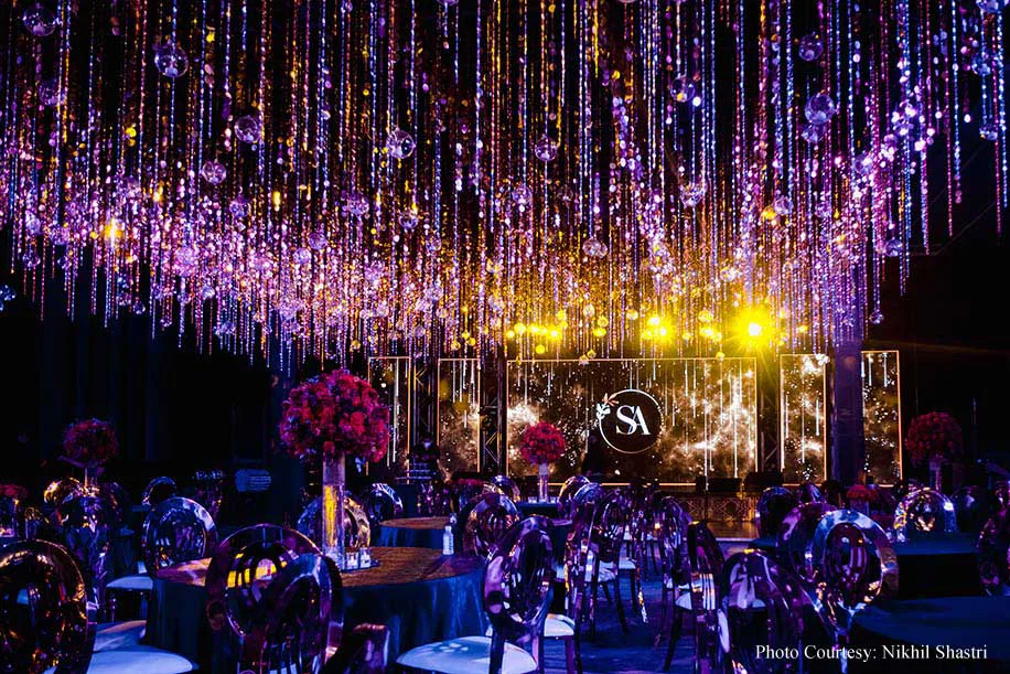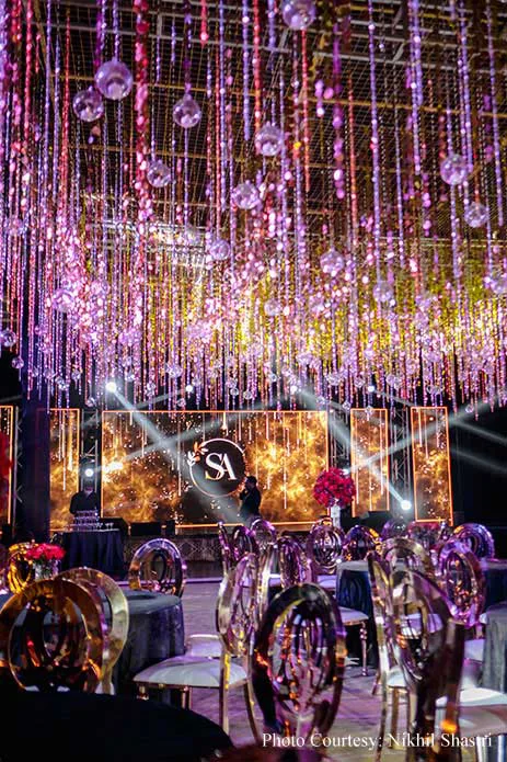 Elegant and glamorous, the sangeet’s highlight was the huge stage where the couple began the evening by exchanging rings. Later, the music was turned up and the lights bathed the venue in a warm glow as everyone enjoyed the couple’s dance performance. Suspended sequins and acrylic vases brimming with flowers decorated the venue.