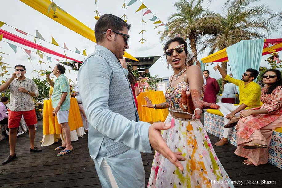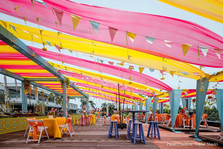 After the Ganesh Staphna, which is customary in Sindhi weddings, the couple started their festivities with a bright mehndi by the poolside. Sheltered by pink and yellow drapes, the guests thoroughly enjoyed their time under the sun at this ‘Madras Madness’ themed party. Breezy seating options and quirky decor elements put everyone in the mood to mingle. Plus, a dancefloor ensured that there was plenty of space to shake a leg.