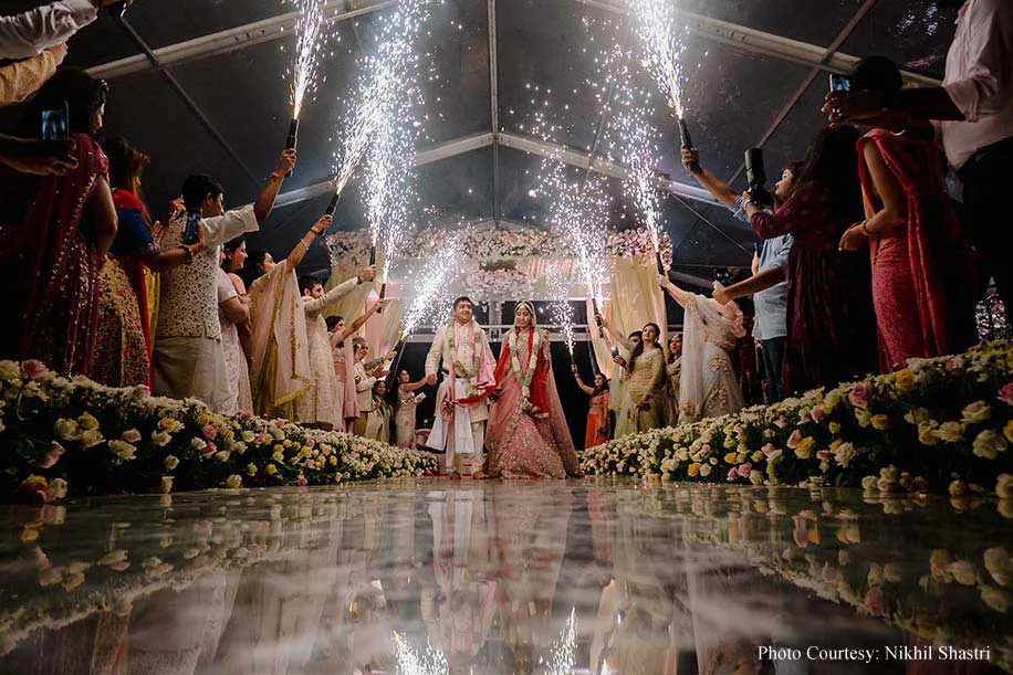 Flaunting a muted pastel colour palette, the wedding decor was modern but at the same time, paid homage to the couple’s roots. Dainty pink and white roses, a reflective aisle and acrylic furniture were paired with each other seamlessly to give the event a luxurious yet ethereal look. Later on, the couple and their loved ones proceeded to enjoy a sumptuous wedding dinner.