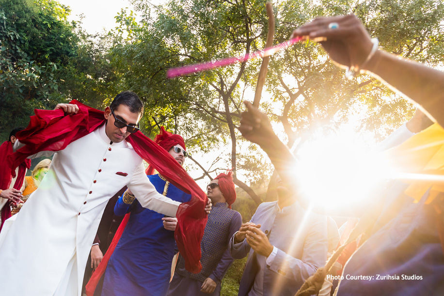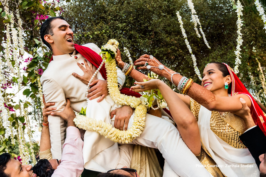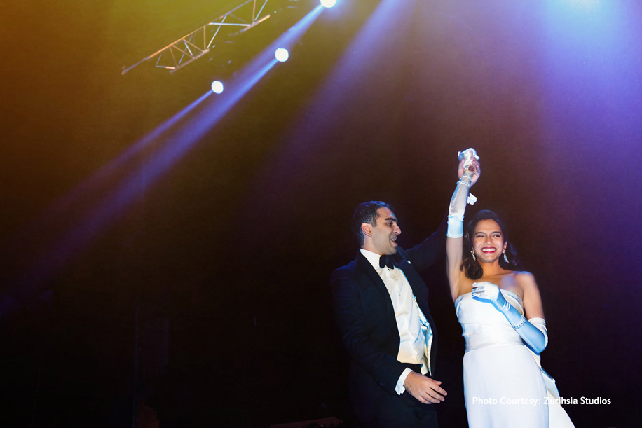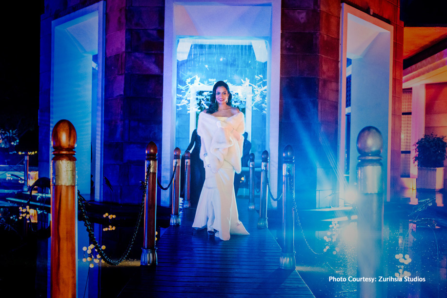 With the tea service over, it was time to play up the drama with a theme that truly stood out. The sangeet and cocktails were hosted at the Leela Palace, Udaipur in a set up inspired by tropical rainforests. Specially designed by architect Rooshad Shroff, the decor boasted fauna typical to the dense jungles. The bride wore a sleek white gown while the groom opted for a black tuxedo. The couple had invited a band who performed live and had the crowds dancing until sunrise!