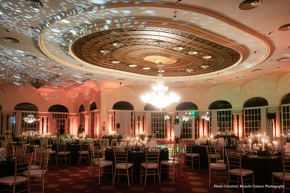 Anokhi Sandip Sriram Magodia and Sridhar Seshu Magodia Sriram’s reception unfolded in a grand ballroom steeped in timeless elegance. Gilded chandeliers cast a soft glow over tables accented with candlelight and delicate florals. The ambience was intimate yet opulent, with shimmering ceiling projections creating a dreamlike atmosphere. The couple’s first dance beneath the sparkling lights was a heartfelt moment of joy, while the evening soon gave way to high-energy celebrations. Surrounded by friends and laughter, the newlyweds revelled in a night that was a perfect finale to their beautifully orchestrated wedding.
