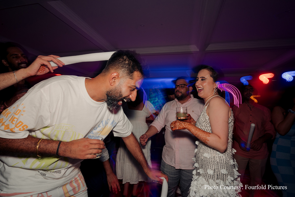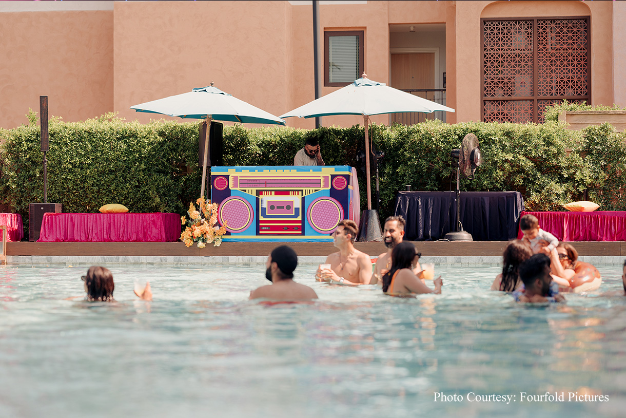 The next morning dawned with a traditional Haldi ceremony. To stand out amidst the yellow decor and yellow-clad guests, the bride and groom looked radiant in fuchsia as their loved ones showered them with flowers and turmeric. The occasion was followed with the fun and frolic of a pool party, where everyone unwinded and cooled off before gearing up for an evening of enjoyment.