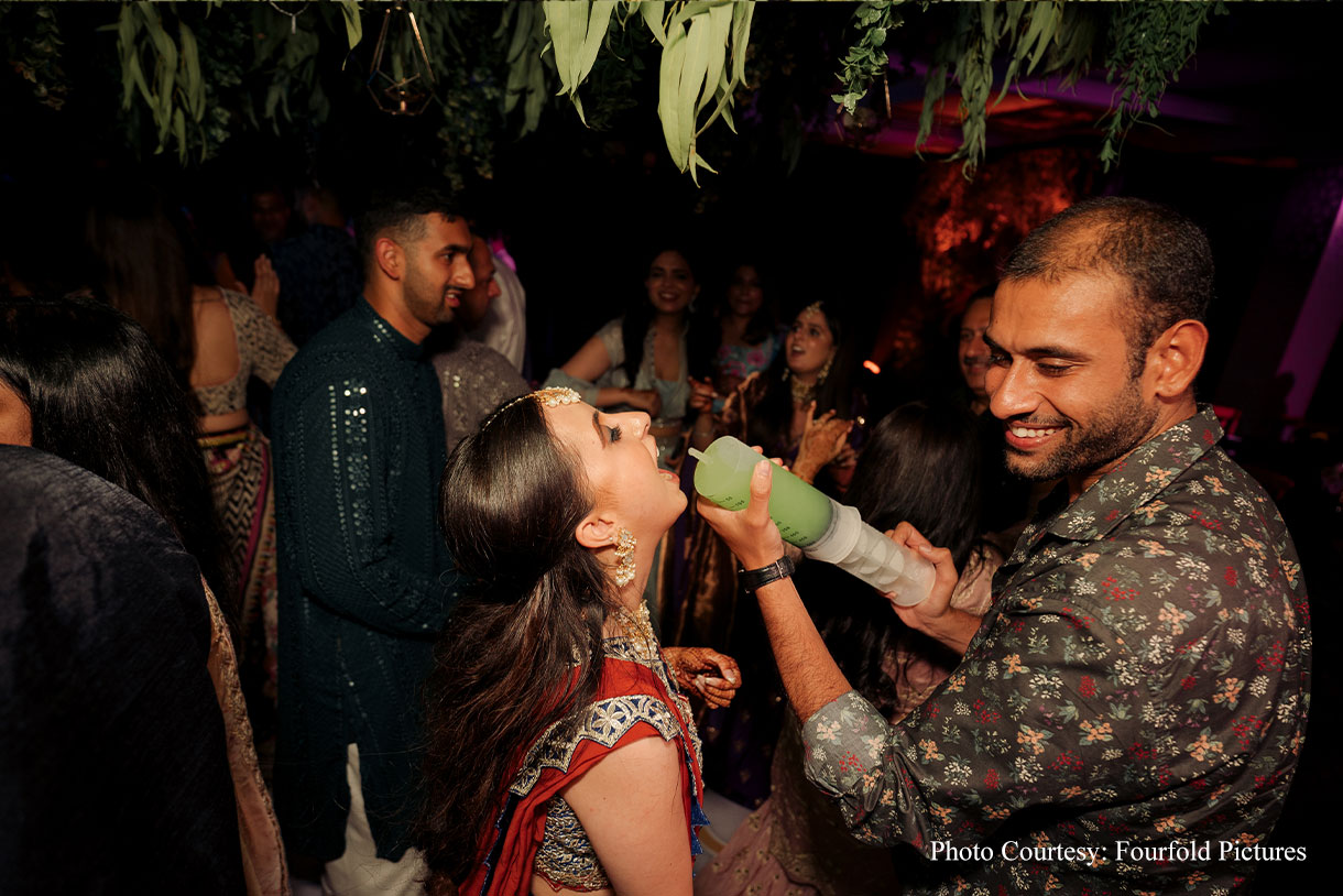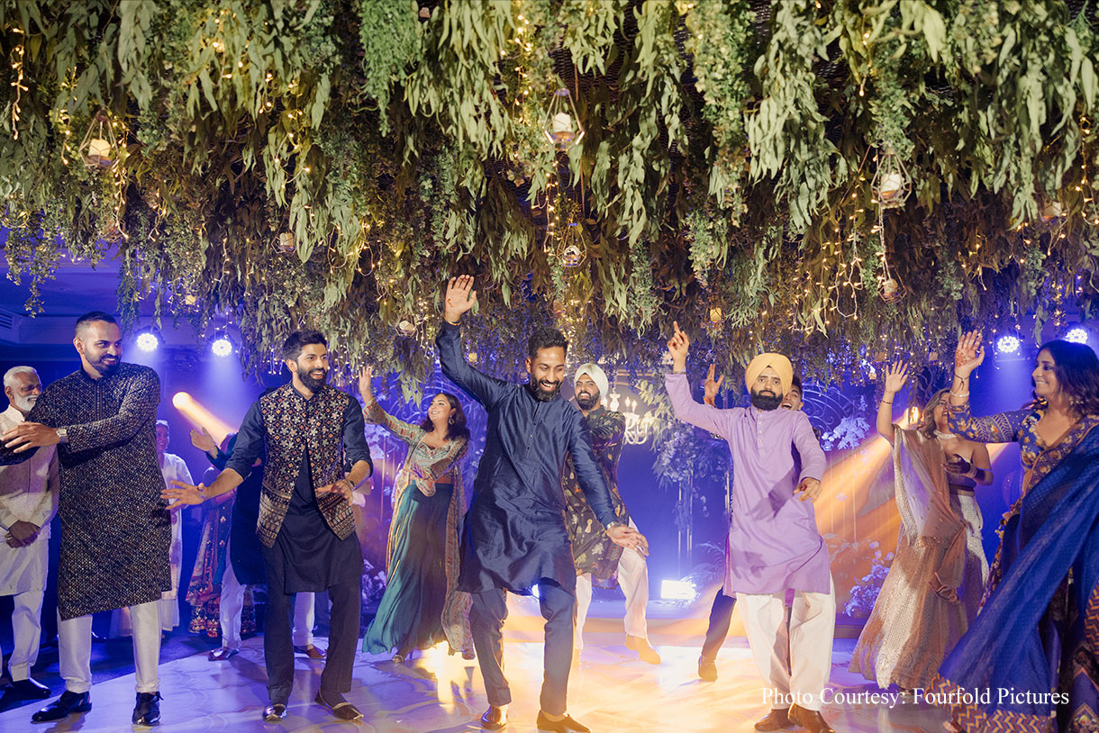 Taking a cue from the couple’s love for nature and long walks, the Sangeet evening transported the guests to an enchanted forest filled with lush foliage, sparkling disco balls, crystal accents, and more. From the entry decor to the stunning stage setup, the wild and exotic arrangements filled the evening with an air of tropical luxury. The couple and their loved ones took to the stage with incredible performances and danced away the night with delicious cocktails and rousing music.