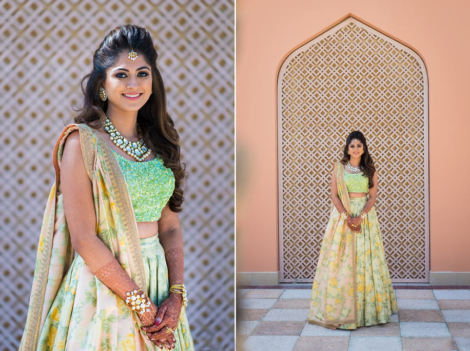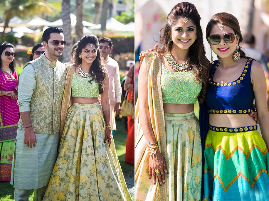 “The mehndi celebrations were hosted next day on the expansive green lawns of the hotel, overlooking the beach. The decor for this event was inspired by the pristine blue waters of the sea. There were beautiful Moroccan-inspired, white ‘jaali’ cabanas interspersed with low tables and large cushions for our guests to rest on. The function had a relaxed vibe and was organized to resemble a fun sundowner. I wore a gorgeous lime green and yellow Sabyasachi Mukherjee ensemble for the main mehndi event.”
