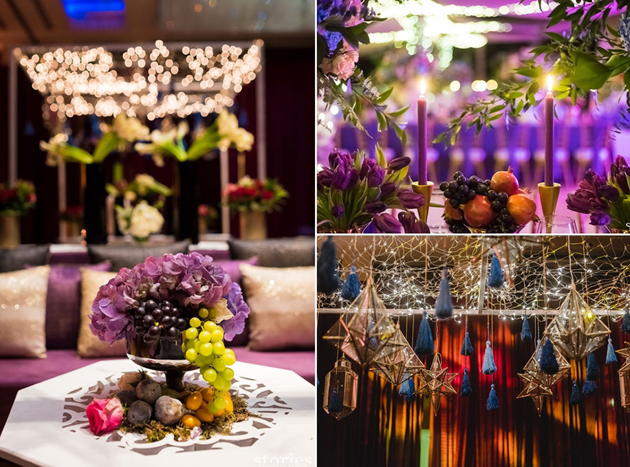 “We tried to create a feeling of chic royalty, one that represents new-age ‘maharajas’ (kings). Therefore, the decor for the sangeet was kept minimal yet opulent. The center stage represented ancient Arabic architecture with ‘jaalis’ and arches. The tables were decorated with flowers and candles.