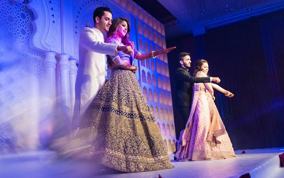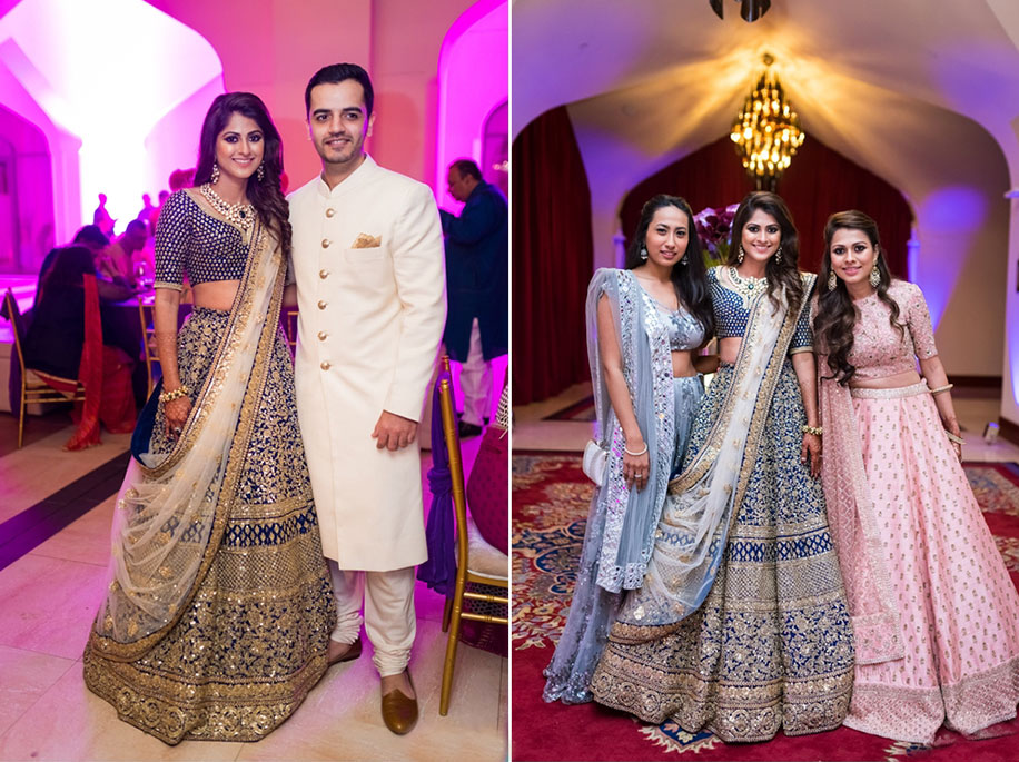 The bar was built out of a ‘jaali’ cutout and had backlit arches of cobalt and purple. My sangeet outfit was by far the most stunning lehenga I had ever worn. It was a classic Sabyasachi Mukherjee piece which was fully embellished with dull gold zari and glitter. The blue beautifully contrasted with the gold and was a perfect stunner during my constant twirl sessions!”