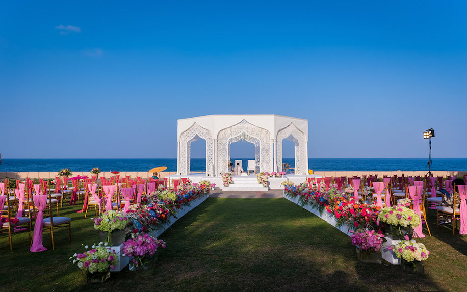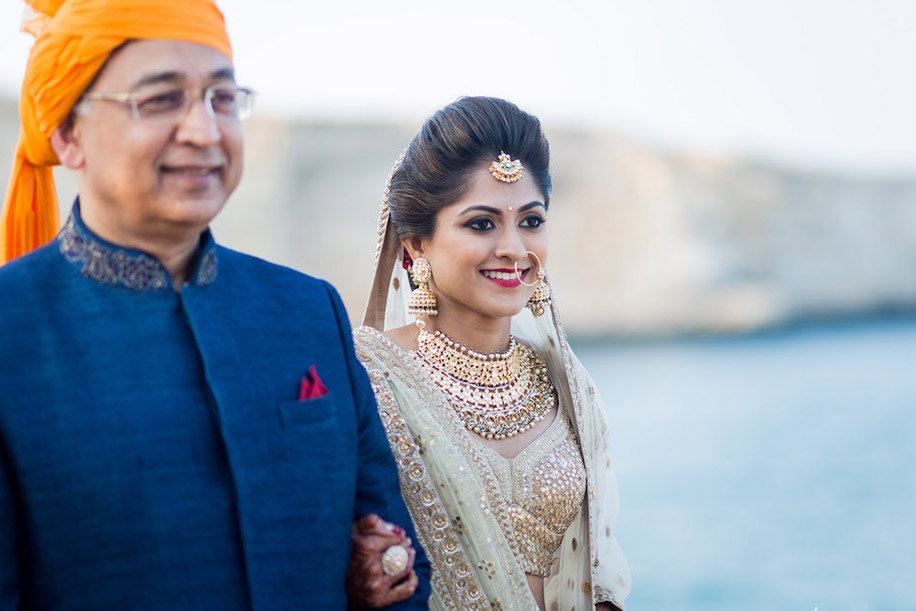 Anusha and Dhrumil’s perfect beachside destination wedding included elements that were inspired by the rich history and architecture of their stunning venue, such as arches, harps and magnificent backdrops such as the sea and mountains.