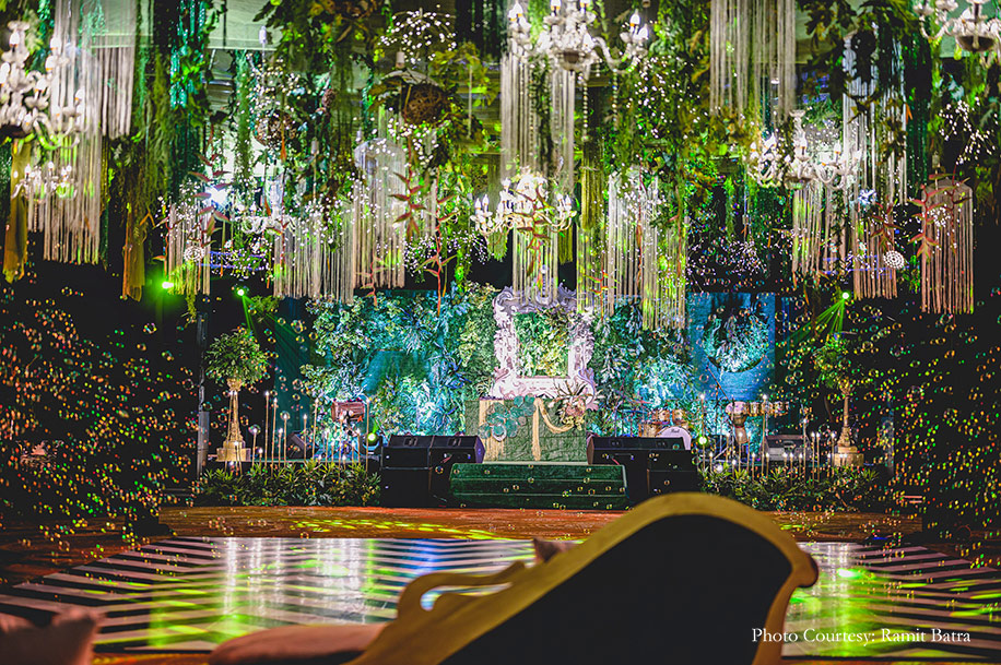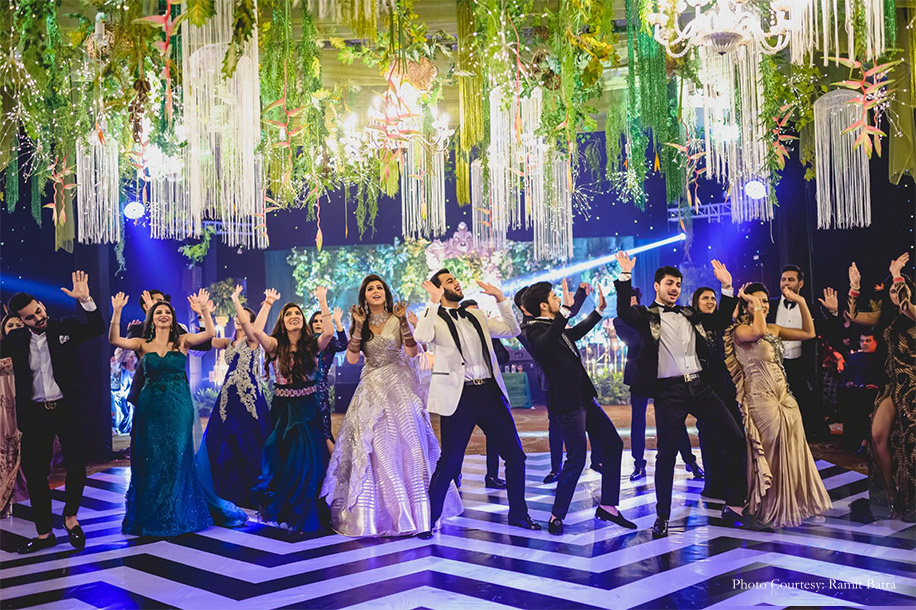 The tropical jungle themed Sangeet saw enchanting décor of exotic foliage interspersed with beautiful crystal props over and around a massive chevron print dance floor. The evening was heady with stunning performances by the couple and their loved ones before everyone got down to groove. The groom wore a suave white tuxedo while the bride dazzled in a gold cocktail gown by Amit Aggarwal.